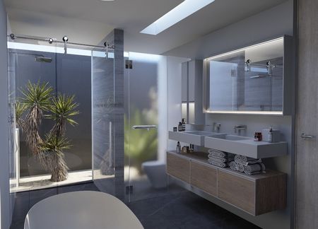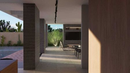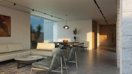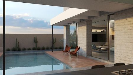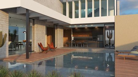 En total, la casa dispone de 4 baños completos y 2 medios baños, todos con un diseño sofisticado y elementos naturales. El acceso principal conduce a un vestíbulo con diseño escultórico que conecta con un canal de agua ornamental que fluye hacia una espectacular alberca central, pieza clave del área social.
