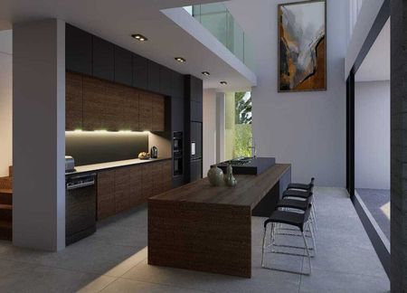 La cocina de doble altura, con acabados de lujo y abierta a la zona social, se convierte en el corazón del hogar, ideal para el entretenimiento o la convivencia familiar de alto nivel.