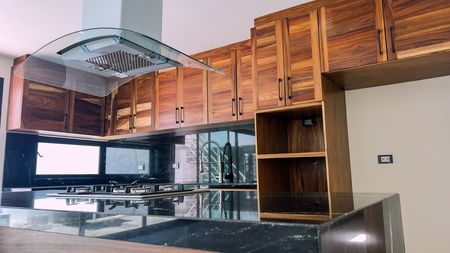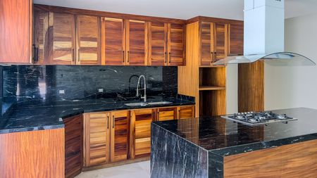 Solid parota woodwork in closets, kitchen, and doors, adding warmth and a cozy atmosphere.